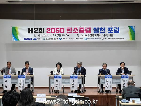 포럼은 (사)탄소중립실천연대 이우범 상임대표가 좌장을 맡아 서울에코클럽 오성남 숭실대학교 특임교수의 주제발표를 시작으로 ▲여수시도시관리공단 김유화 이사장 ▲여수시‧여수산단공동발전협의회 김신 사무국장 ▲김종일 전라남도 탄소중립지원센터장 ▲심정현 MG여수한려새마을금고 ESG운영위원장이 토론에 참여했다.
