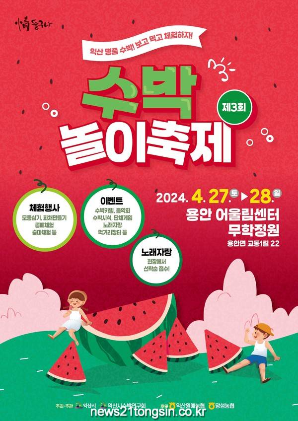 익산시는 지역농산물 소비촉진을 위한 '제3회 수박놀이축제'가 용안면 용안어울림센터 일원에서 오는 27일부터 28일까지 2일간 열린다고 밝혔다.