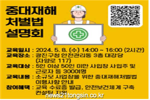 대상은 광진구에 소재한 5인 이상 50인 미만 사업장이다. 음식점, 학원, 어린이집, 제조업, 전통시장 등 모든 업종이 해당된다. '안전보건교육포털'에서 선착순 300명을 모집하고 당일 현장 신청도 가능하다.
