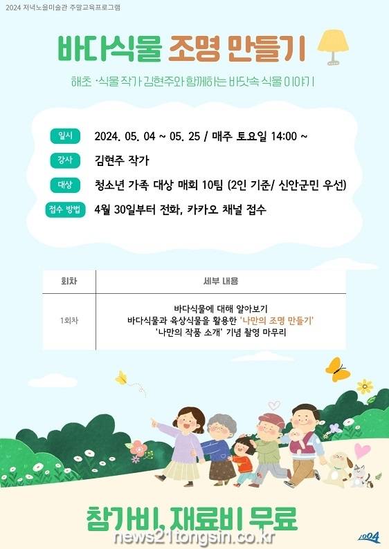 신안군의 저녁노을미술관은 2024년을 맞이하여 문화예술교육 프로그램 '바다식물 조명 만들기'에 참여할 참가자를 모집한다고 밝혔다.