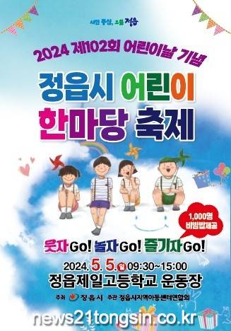 정읍시가 제102회 어린이날(5월 5일)을 맞아 정읍제일고등학교 운동장에서 기념행사를 개최한다고 1일 밝혔다.