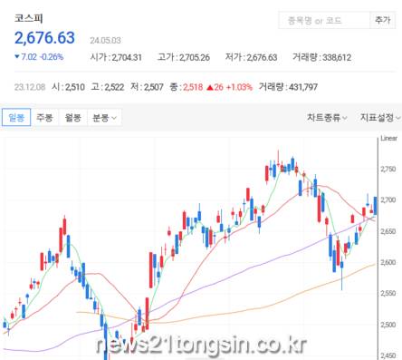 코스피 지수는 2670선까지 내려갔고, 코스닥 지수는 860선에서 횡보했다. 이날 유가증권시장에서 코스피 지수는 2676.63에 거래를 마쳤다.