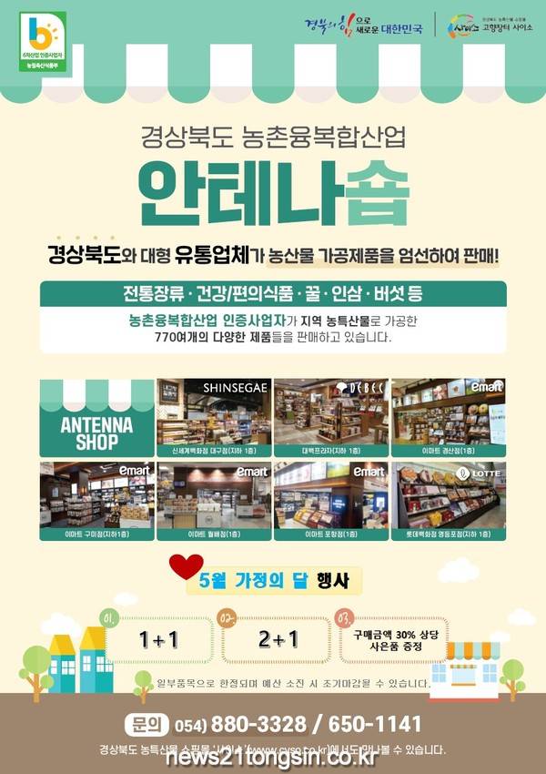 경상북도는 이달 31일까지 농업 6차(농촌 융복합)산업 안테나숍 7개소(대백프라자점, 이마트(경산점, 구미점, 월배점, 포항점), 신세계백화점 대구점, 롯데백화점 영등포점)에서 ‘2024년도 가정의 달 특판’행사를 개최한다.