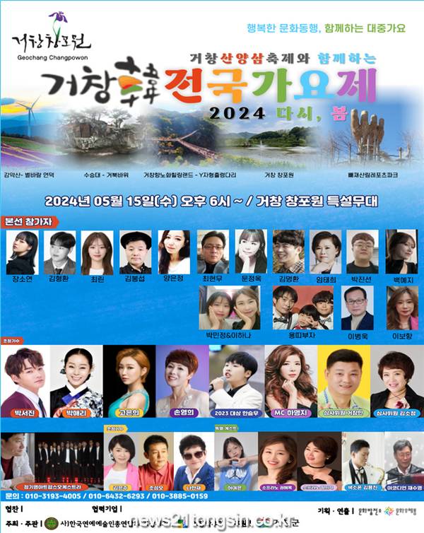 경남 거창군은 2024 거창韓 전국가요제가 5월 15일 수요일 오후 6시부터 거창창포원 잔디광장 특설무대에서 개최한다고 7일 밝혔다.
