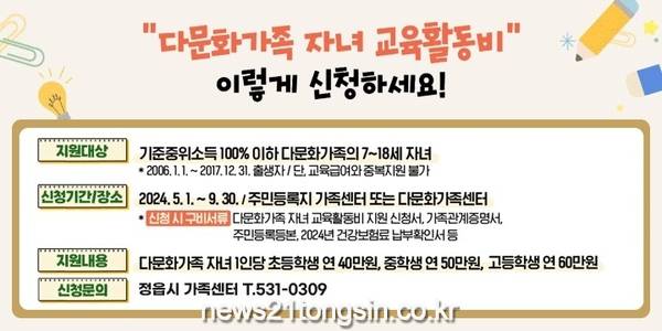 정읍시가 저소득 다문화가정 자녀의 교육활동비를 지원한다고 8일 밝혔다.