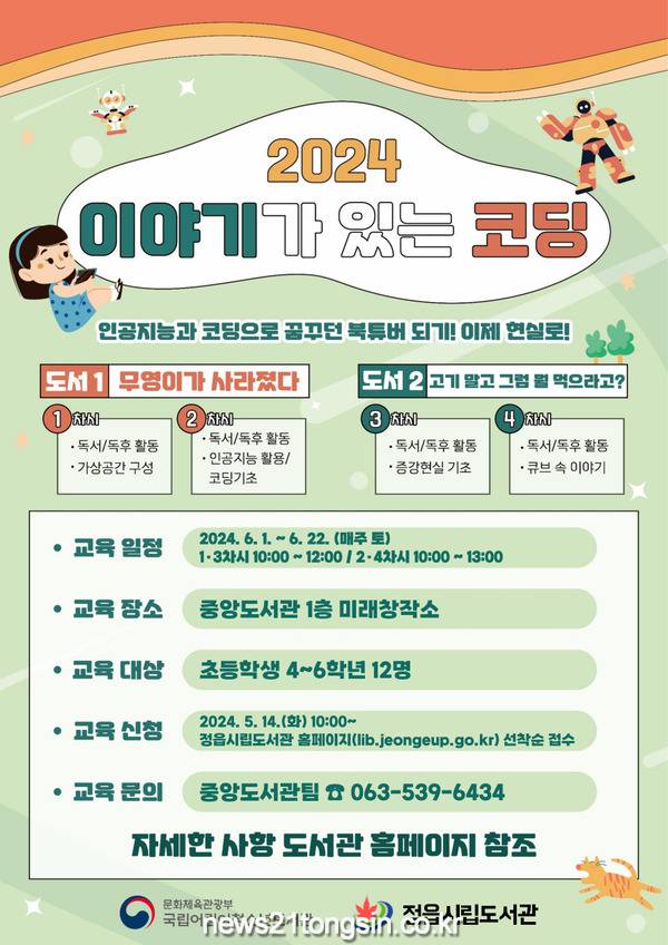 정읍시립중앙도서관이 국립어린이청소년 주관 ‘2024년 이야기가 있는 코딩’ 공모사업에 선정돼 참여할 어린이를 모집한다고 10일 밝혔다.