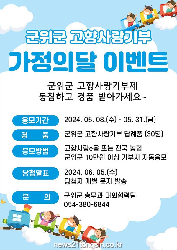 대구 군위군은 5월 가정의 달을 맞아 이달 8일부터 31일까지 고향사랑기부제 참여자에게 경품(답례품)을 제공하는 이벤트를 진행한다고 밝혔다.