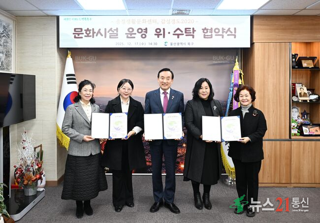[뉴스21 통신=최병호 ]*사진출처-울산북구청북구는 17일 구청장실에서 '국악이랑'·'울산국악실내악단 소리샘'과 송정생활문화센터·감성갱도2020 운영 위·수탁 협약을 각각 체결했다. 박천동 구청장과 수탁기관 대표 등이 협약 체결 후 기념촬영을 하고 있다.