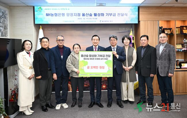 [뉴스21 통신=최병호 ]*사진출처-울산북구청NH농협은행 양정지점은 17일 북구청장실에서 울산숲 활성화를 위한 기부금 500만원을 울산숲사회적협동조합에 전달했다.