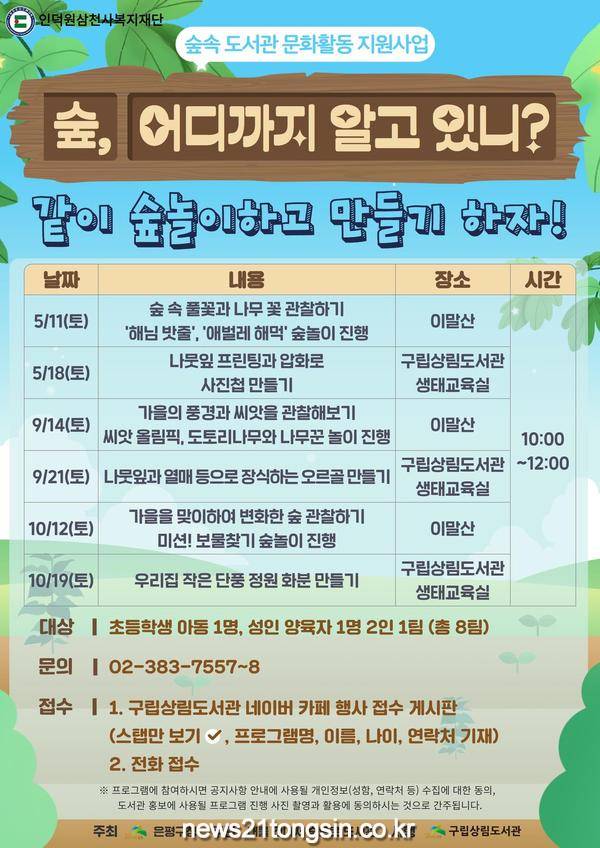이 사업은 은평구청이 주최하고, 내를 건너서 숲으로 도서관이 주관한다. 오는 10월 19일까지 진행되며 가족과 함께하는 숲놀이 체험과 숲에서 얻은 재료를 활용한 다양한 작품 만들기로 구성돼 있다.