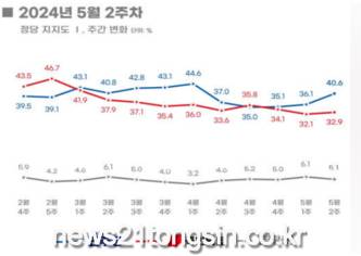 민주당과 국민의힘 간 지지율 격차는 7.7%포인트로 지난주 4.0%포인트에서 더 벌어졌다. 양당 간 지지율 격차가 오차범위(신뢰수준 95%에 표본오차 ±3.1%포인트) 밖으로 벗어난 것은 4월 첫째 주 이후 5주 만이다.