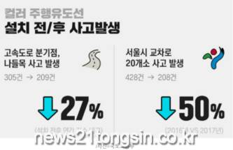 이후 전국에 확산되었고, 색깔 유도선 설치 전후 사고 발생이 27% 줄어들었다고. 국토교통부 통계에 의하면 서울시 교차로 기준으론 2016년 대비 2017년에 50% 줄었다.