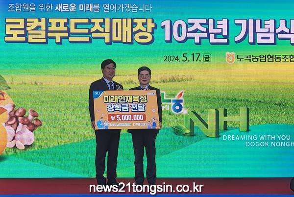 [뉴스21통신 박찬웅 기자] 전라남도는 화순 도곡농업협동조합이 지난 17일 도곡농협 제3농산물 유통센터에서 개최한 로컬푸드 직매장 10주년 기념식에서 전남도와 화순군 장학회에 각각 500만 원의 장학금을 기탁했다고 밝혔다.
