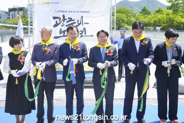강 시장은 이날 국립아시아문화전당(ACC) 플라자브릿지에서 전시 중인 ‘광주와 노무현 특별사진전’ 개막식에 참석해 노무현 전 대통령이 바랐던 ‘사람 사는 세상’의 뜻을 되새기고 국립아시아문화전당, 5·18민주화운동, 무등산 산행 등 광주와의 인연을 되돌아봤다.