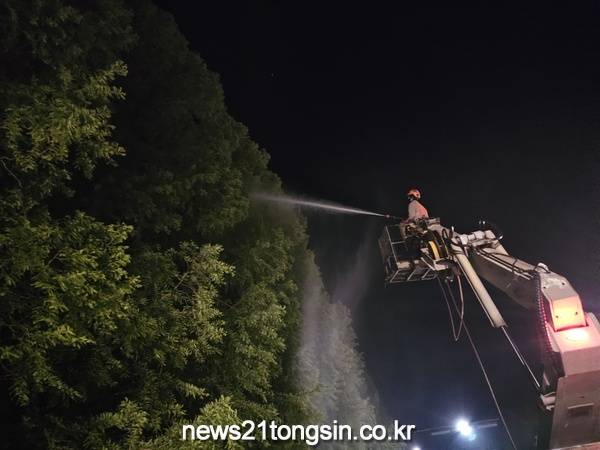 이번 작업은 가로수가 매년 여름철부터 응애 등 병해충과 및 볕 뎀 현상으로 갈변현상이 발생하여 생육이 저하됨에 따라 건강한 메타세쿼이아 생육을 위하여 선제적으로 추진했다.