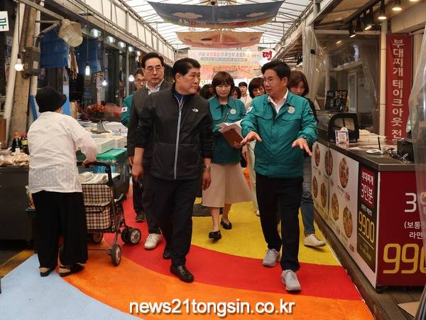 박강수 마포구청장은 23일 오후, 보행도로 포장 개선공사가 진행되고 있는 아현시장을 방문했다.