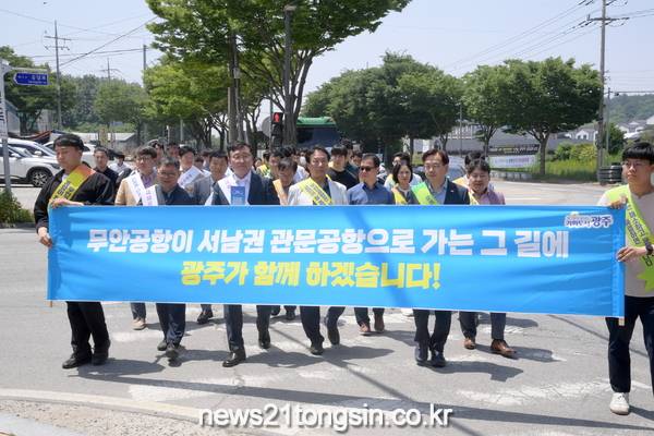 ▲ 민군 통합공항 무안 이전 홍보 캠페인명창환 전남도 행정부지사는 “서남권 대표 관문인 무안국제공항을 활성화해 광주‧전남이 함께 잘 살 수 있도록 해야 한다”며 “민‧군 통합공항에 대한 올바른 사실을 군민들에게 알리고 협조를 부탁하기 위해 캠페인에 나섰다”고 말했다.