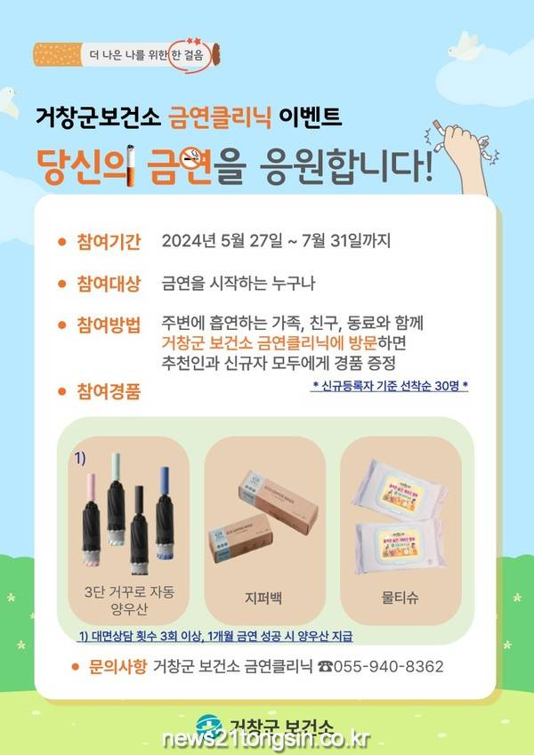 거창군은 5월 31일인 ‘제37회 세계 금연의 날’을 기념해 보건소 금연클리닉에서 5월 27일부터 7월 31일까지 ‘당신의 금연을 응원합니다.’라는 주제로 이벤트를 진행한다고 27일 밝혔다.
