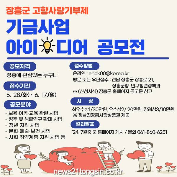 장흥군이 고향사랑기부제 활성화 및 지역 여건을 반영한 고향사랑기금사업 아이디어 제안 공모전을 개최한다고 밝혔다.