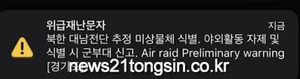이번 재난문자는 합동참모본부가 경기와 강원 접경지역 일대에서 대남 전단 추정 미상 물체를 식별해 보내진 조치로 일부 물체는 떨어진 것으로 알려졌다.