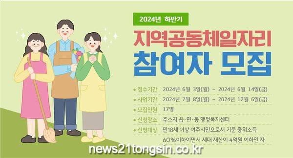 여주시가 오는 2024년 6월 3일부터 14일까지 취업취약계층을 위한 「2024년 하반기 지역공동체일자리사업」 참여자를 모집한다.