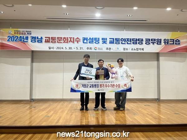 경남 거창군은 2023년 경상남도 시‧군 교통행정 분야 평가에서 우수 시‧군으로 2년 연속 선정되어 30일 경상남도 주관 2024년 교통문화지수 컨설팅 및 교통안전담당 공무원 워크숍에서 기관 표창과 특별조정교부금 1억 원을 확보했다고 밝혔다.