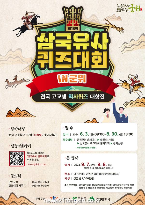 TBC가 주최·주관하고, 대구광역시와 군위군이 후원하는 ‘제15회 삼국유사 퀴즈대회'가 9월 7일(토)부터 8일(일) 군위군에서 개최된다.