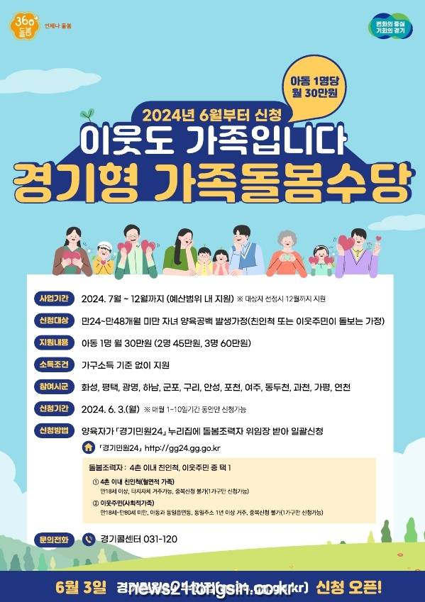 여주시는 생후 24~48개월 미만 아동을 돌보는 4촌 이내 친인척 또는 이웃주민을 대상으로 아동 수에 따라 최대 60만원을 지급하는 ‘경기형 가족돌봄수당’을 6월부터 시행한다고 밝혔다.