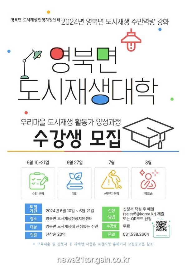 한편, 「2024년 영북면 도시재생대학」 수강생 모집과 관련된 자세한 문의는 영북면 도시재생현장지원센터(☎031-538-2664)로 전화하면 된다.