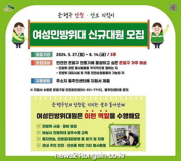 은평구(구청장 김미경)은 안전한 우리동네 은평 만들기를 위해 오는 14일까지 순수봉사단체 여성민방위대 신규 대원을 모집한다고 밝혔다.