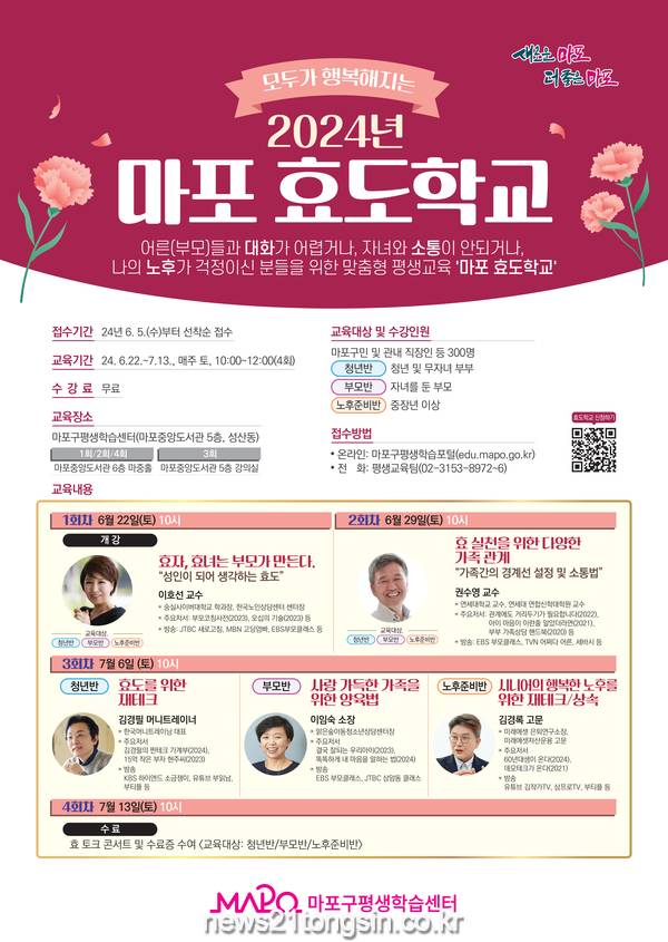 박강수 마포구청장은 “다양한 세대가 공감할 수 있는 효도 교육을 준비하기 위해 각 분야의 전문가들을 초청했으니 많은 관심과 참여 부탁드린다”라며 “효도학교를 통해 세대 간의 거리를 좁히고 서로 존중하는 문화가 조성되길 바란다”라고 말했다.
