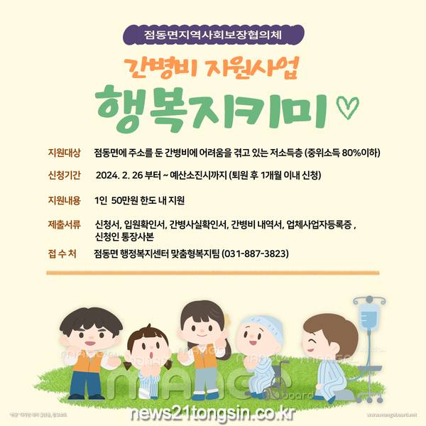 점동면 지역사회보장협의체는 병원 입원 시 간병비로 어려움을 겪는 대상자를 발굴하여 지원하는 여주시 최초 사업으로 보도자료, 밴드, 병원 방문 등을 활용하여 적극적으로 대상자 발굴· 지원하고 있다. 대상은 중위소득 80%이내 저소득층이고 신청 서류는 간병비 영수증, 병원입원확인서 등 신청 시 지원 자격 확인 후 지원한다.