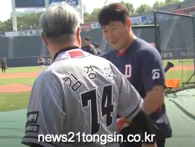 그라운드에 들어선 옛 스승을 알아보고 이승엽 감독이 먼저 다가와 여러 차례 고개를 숙이며 인사를 건넸고, 김 감독도 예우를 갖추며 덕담으로 화답했다.