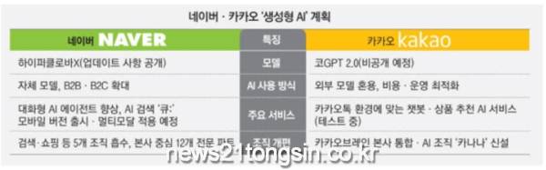 국내 정보기술(IT) 업계 양대 산맥인 네이버와 카카오가 생성형 인공지능(AI) 서비스 고도화에 속도를 내고 있다.