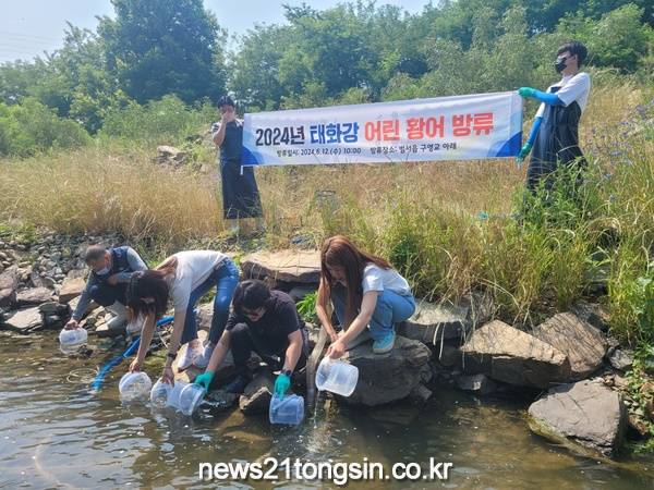 (뉴스21통신/우정석기자) = 울주군 태화강생태관이 12일 범서읍 구영교 일대에 태화강 회귀어류인 어린황어 6만5천마리를 방류했다.