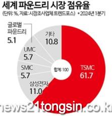 1분기 파운드리(반도체 위탁생산) 시장에서 1, 2위를 차지하는 대만 TSMC와 삼성전자의 점유율 격차가 커진 것으로 나타났다. 3위를 유지해오던 미국 글로벌파운드리는 5위였던 중국 SMIC와 자리를 맞바꾸며 두 계단 하락했다.