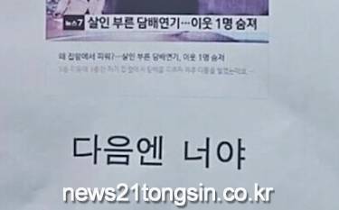 경기도의 한 아파트 엘리베이터에 붙은 섬뜩한 경고문에 '살인 부른 담배 연기'라는 기사 사진 아래 "다음엔 너야"라는 문구가 눈에 띈다.