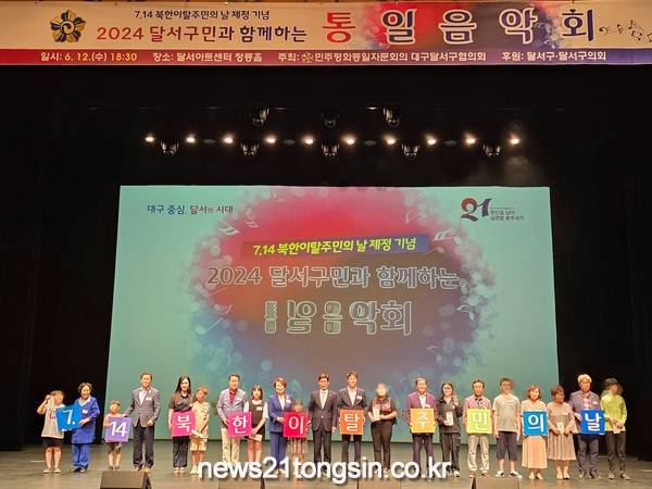(뉴스21통신) 박창남기자 = 대구달서구협의회(회장 이미영)는 6.12(수) 달서아트센터 청룡홀에서 민주평화통일자문회협의회, 이태훈 달서구청장, 김해철 달서구의회의장 등을 비롯한 북한이탈주민과 지역주민, 자문위원 등 500여명이 참석한 가운데 “2024 달서구민과 함께하는 통일음악회”를 개최했다고 밝혔다.