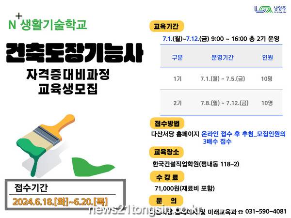 남양주시(시장 주광덕)는 6월 18일부터 6월 20일까지 3일간 인생 다모작을 꿈꾸는 4060세대를 위해 맞춤형 기술교육인 N+생활기술학교 건축도장기능사 자격 과정 교육생을 모집한다고 14일 밝혔다.