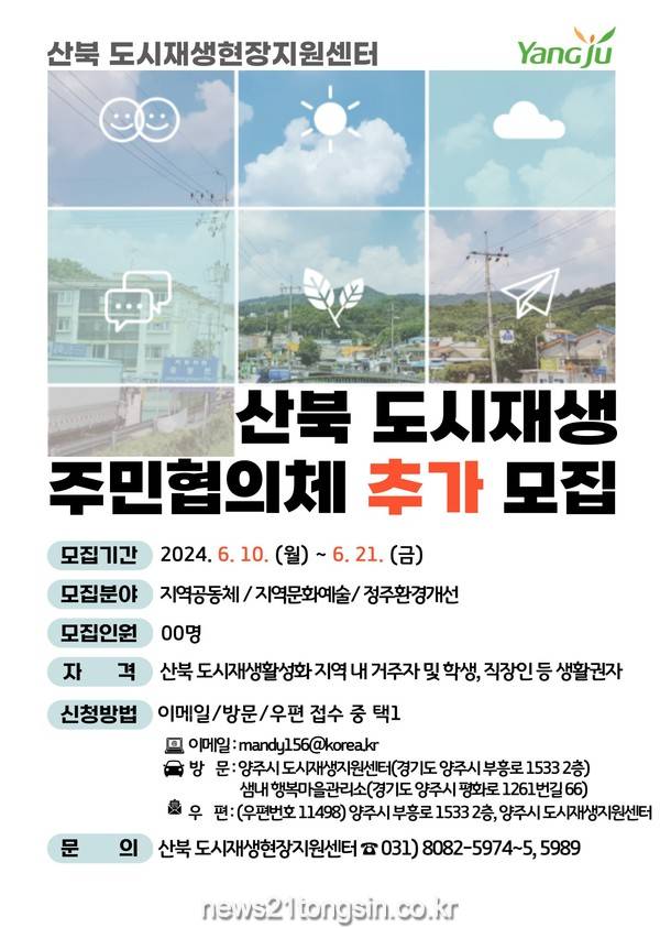 양주시(시장 강수현)가 오는 21일까지 산북 도시재생현장지원센터에서 성공적인 주민주도의 도시재생사업 실현을 위해 주민협의체 회원을 추가 모집한다고 밝혔다.