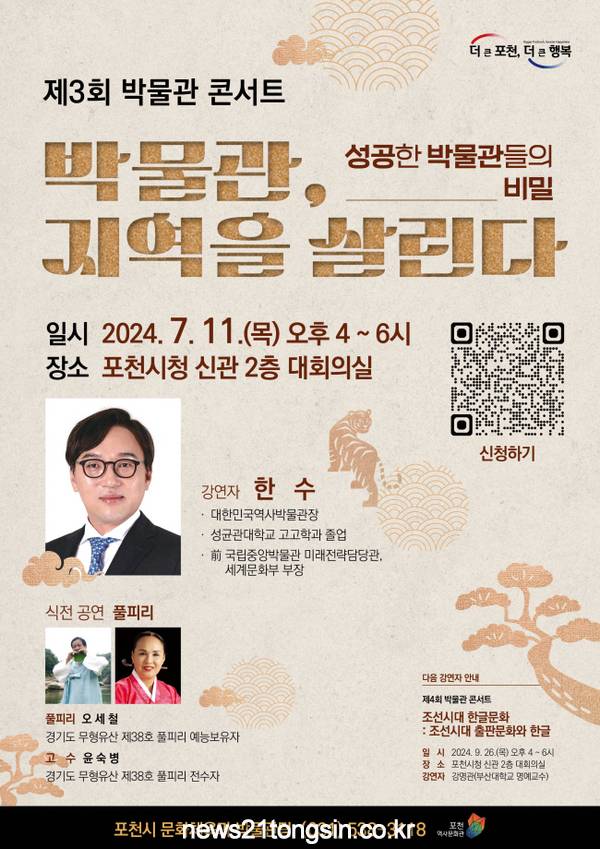 포천시(시장 백영현)는 오는 7월 11일 오후 4시 포천시청 신관 2층 대회의실에서 「2024년 제3회 박물관 콘서트」를 개최한다.