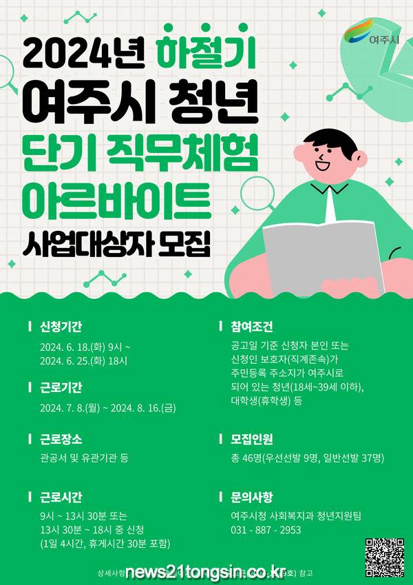 여주시는 하절기 단기간을 이용하여 여주시 청년에게 사회경험의 기회를 제공하고자 청년 단기 직무체험 아르바이트 사업을 추진한다.