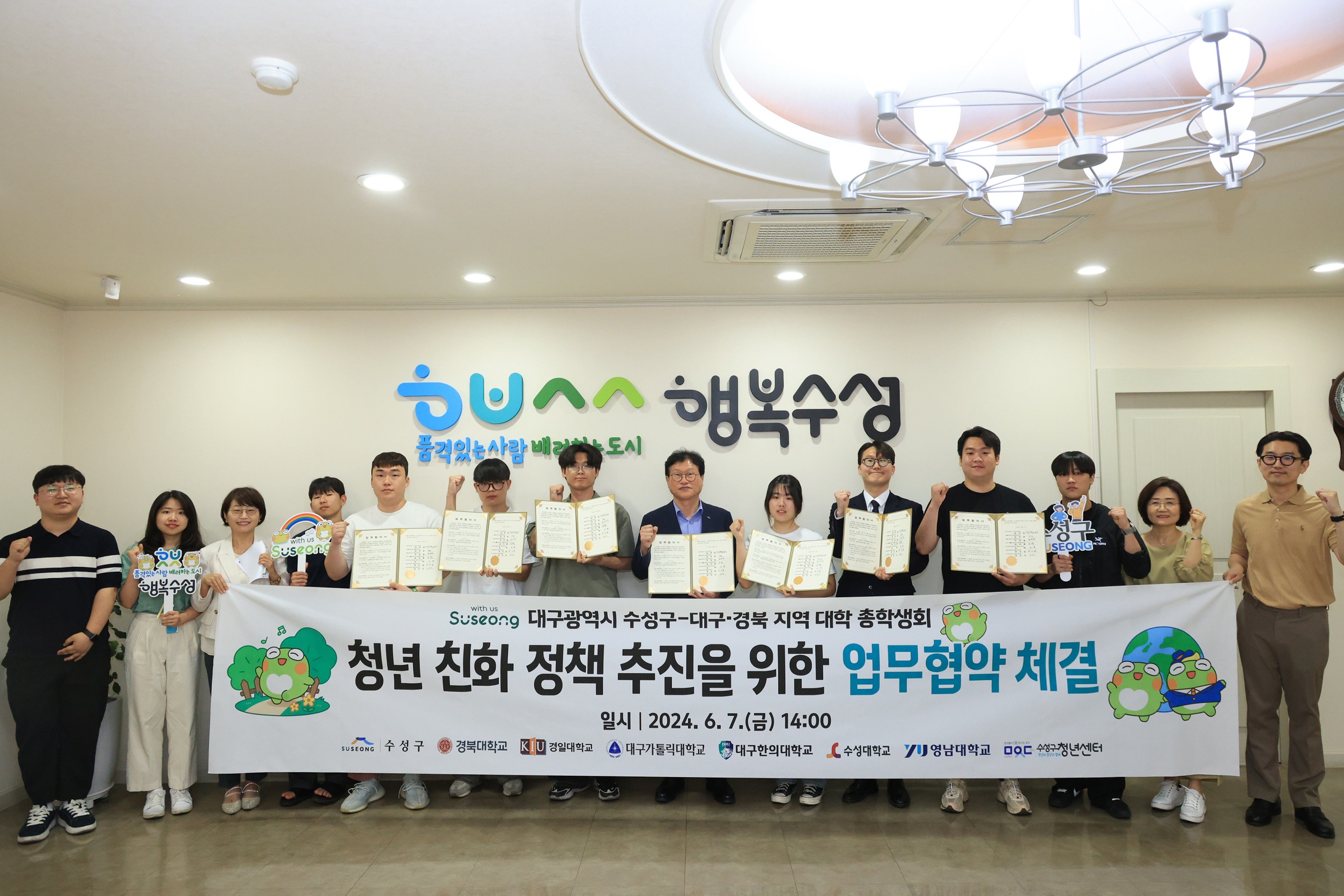 협약식에 김대권 구청장을 비롯한 수성구청 관계자와 경북대학교, 경일대학교, 대구가톨릭대학교, 대구한의대학교, 수성대학교, 영남대학교 6개 대학의 총학생회장과 학생회 임원들이 참석했다.