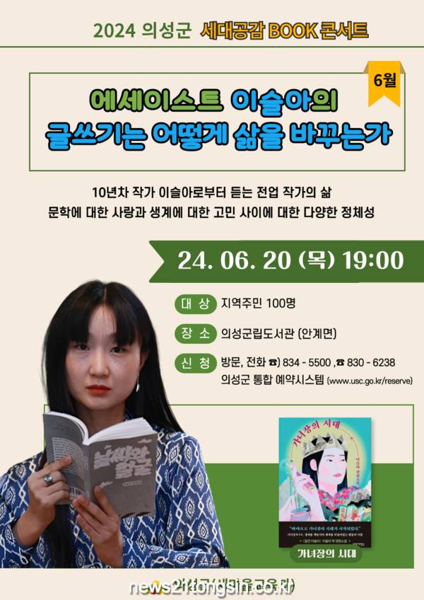 이번 저자강연은 4월 16일부터 12월 5일까지 총 9회 차에 걸쳐 진행되는 의성군의 독서진흥사업 ‘2024 세대공감 BOOK콘서트’의 세 번째 강연으로 현시대를 대표하는 에세이스트 이슬아 작가와 함께 ‘글쓰기는 어떻게 삶을 바꾸는가’를 주제로 진행된다.