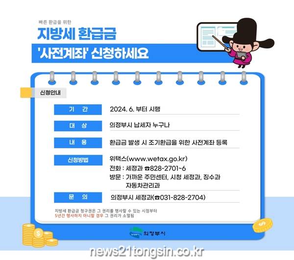 의정부시(시장 김동근)는 지방세 납세자에게 빠르게 환급금을 돌려주기 위해 6월부터 지속적으로 ‘지방세 환급금 사전계좌’ 신청을 받고 있다.