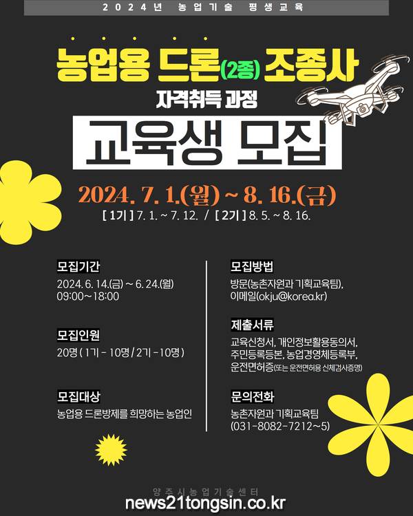 양주시(시장 강수현)는 오는 6월 24일까지 2024년 농업용 드론2종 조종사 자격취득 과정 교육생 20명을 모집한다고 밝혔다.