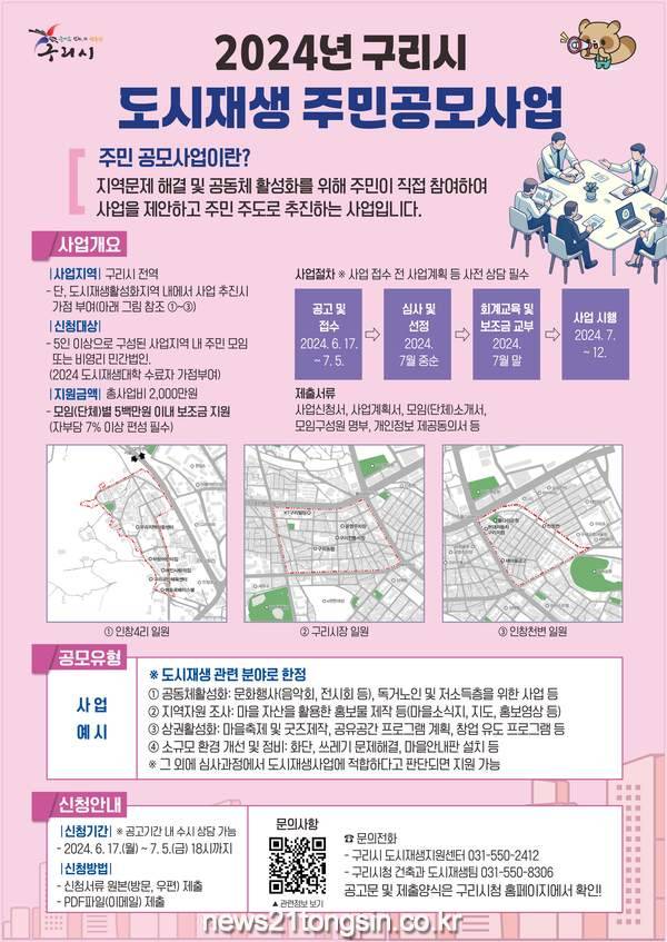구리시(시장 백경현)는 6월 17일부터 7월 5일까지 19일간 지역주민의 적극적인 참여를 통해 지역 사회의 활력을 불어넣고자 ‘주민 참여형 도시재생 공모사업’을 추진한다. 이번 공모사업은 주민이 주도적으로 마을의 문제를 해결하고, 지속 가능한 도시재생 기반을 만들어 가는 것을 목표로 한다.