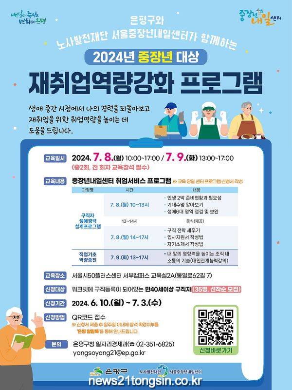 은평구(구청장 김미경)는 내달 3일까지 ‘2024년 중장년 대상 재취업역량강화 프로그램’을 신청받는다고 밝혔다.