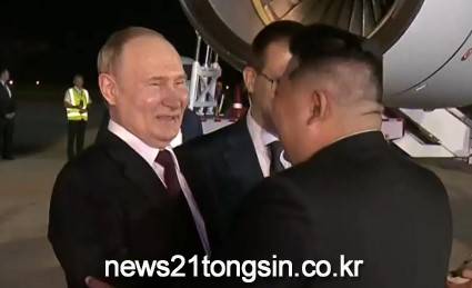 푸틴 대통령이 레드카펫을 밟으며 비행기 계단을 내려왔고 기다리고 있던 북한 김정은 위원장과 환하게 웃으며 인사를 나눴다.