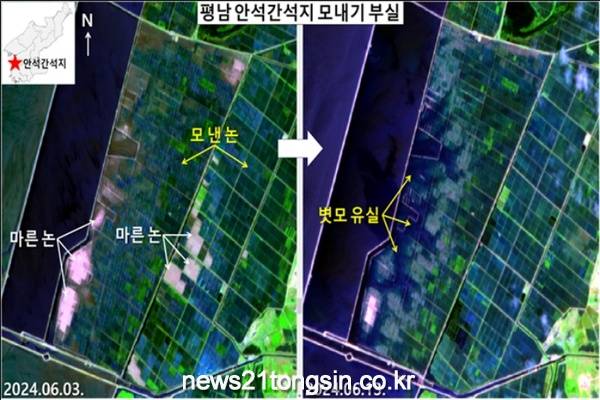 위성자료는 유럽우주청(ESA)이 운영하는 센티넬-2호 영상(해상도 10m)를 활용했다. 북한이 침수 피해복구가 덜 된 안석간석지에서 성급하게 모내기를 추진한 것으로 판단되는데, 이곳 가을 벼 수확은 목표에 크게 모자라는 부실한 수준이 될 것이 우려된다. 태풍 침수 피해 당시 현지를 방문한 젊은 지도자(김정은 국무위원장)의 불같은 진노 영향으로 간석지 복구 및 모내기까지 담당자들이 급히 서두른 데 따른 것으로 평가된다. 결과는 가을 수확이 증명할 것이다.